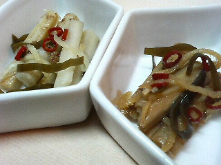 甘酢漬けは花椒と生姜を入れ、醤油漬けは唐辛子多めでピリ辛風に。