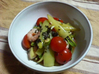 頂き物のプチトマト・甘長君・冷凍庫にあったエビと和えました。