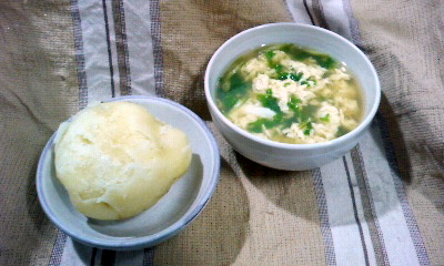 お湯にコンソメスープの素を溶かして、卵1個をつつつーっと。