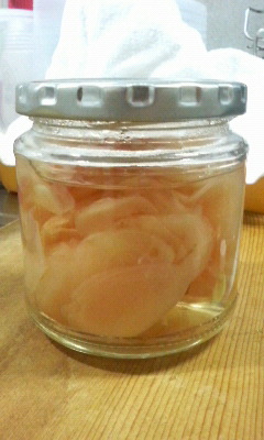 ・酢、みりん、水、砂糖を一煮立ちさせて生姜の入った瓶に投入。